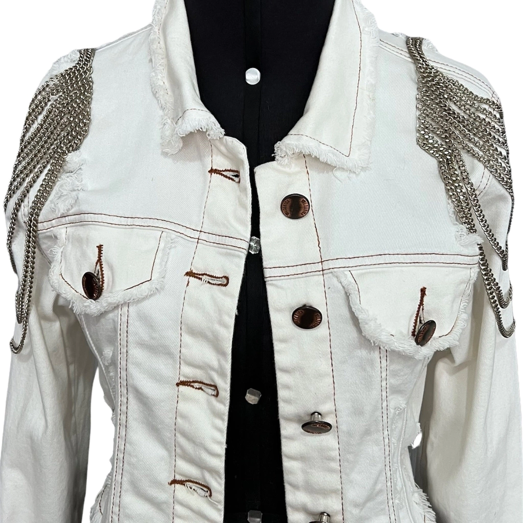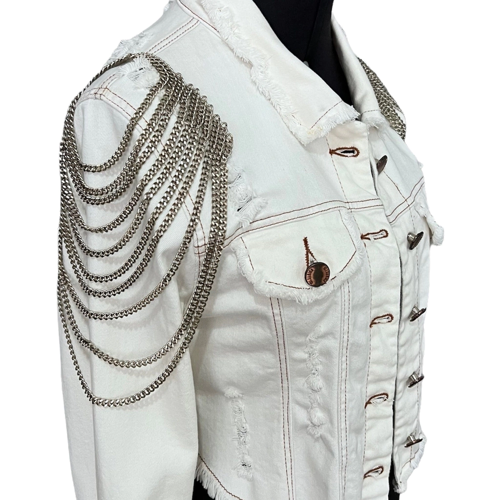 Este aplique em correntes na ,cor prata, pedrarias é perfeito para você que adora ousar e que gosta de um brilho! Valorizam as suas peças, tornando-as únicas. Podem ser aplicados em jaquetas (jeans, couro, etc.), T-shirts, etc.